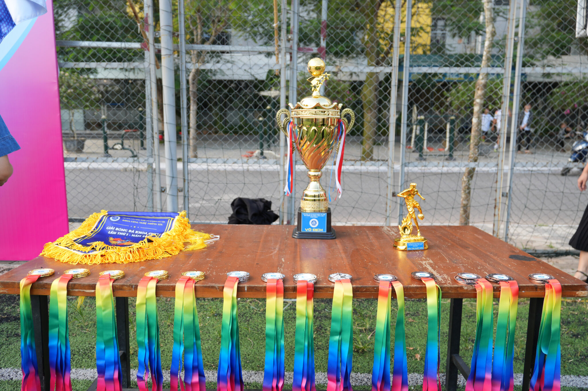 Ban tổ chức Giải Bóng đá Sinh viên Thường niên Khoa CNTT HPC 2024 tặng cờ lưu niệm cho 15 đội bóng và trọng tài