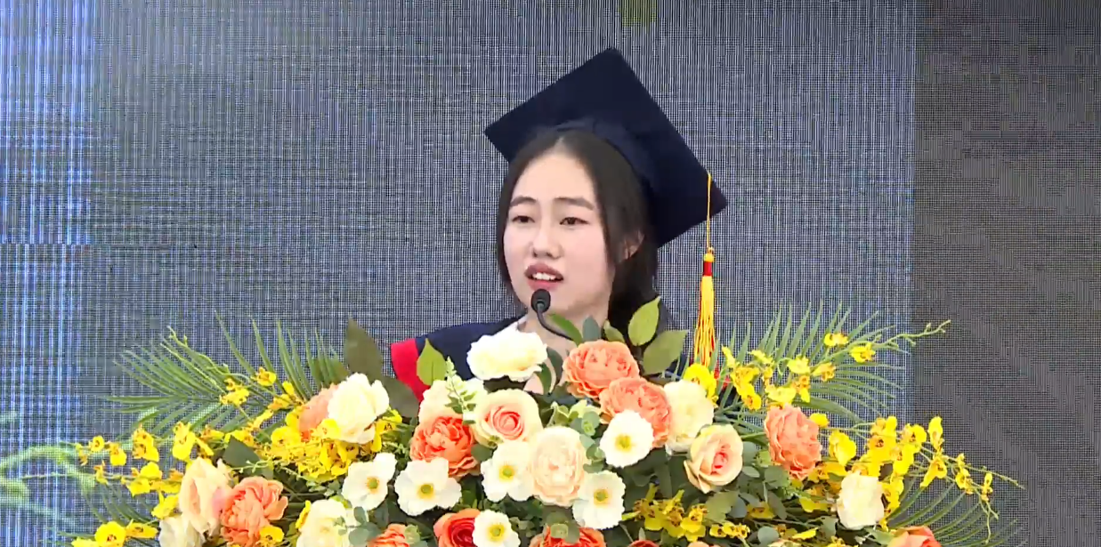 Tân cử nhân Nguyễn Thị Minh Hòa (Thủ khoa – Khoa Du lịch – Khách sạn K21) phát biểu tại Lễ bế giảng và trao bằng tốt nghiệp HPC K21 năm 2024