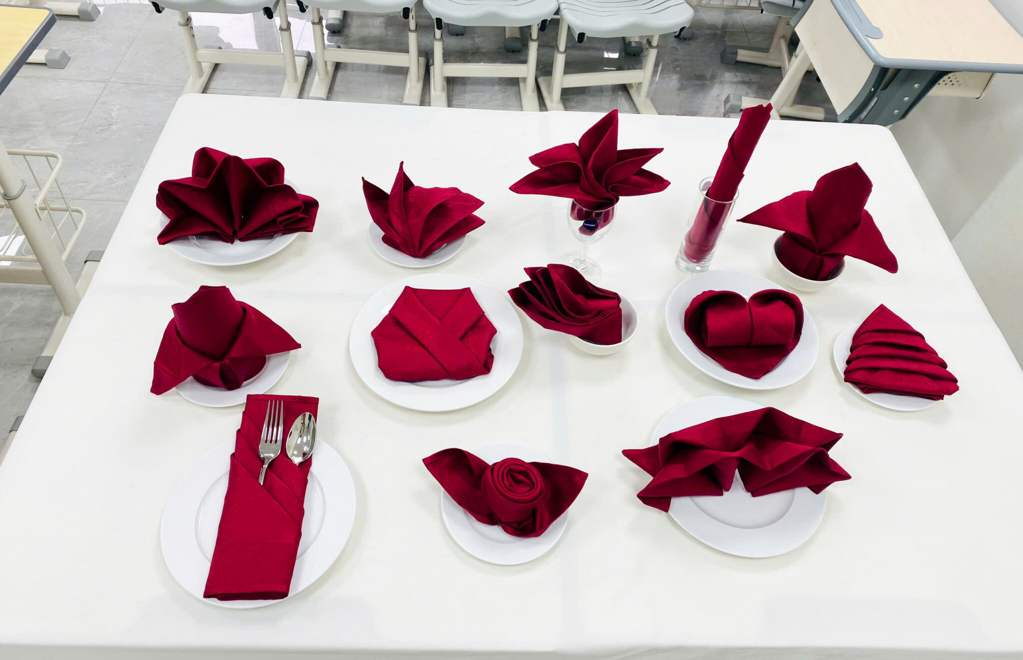 Nhìn các bạn sinh viên chăm chú từng bước gấp khăn, tôi nhận ra: chiếc khăn trải bàn như tôi cũng có thể trở thành một phần trong hành trình trưởng thành ấy. Tôi đã chứng kiến những buổi thực hành đầu tiên đầy bỡ ngỡ. Tôi cũng thấy những ánh mắt sáng lên khi bài gấp hoàn hảo được giảng viên khen ngợi. Có bạn chụp lại từng sản phẩm như ghi dấu bước khởi đầu. Có bạn thì nói nhỏ: “Ngày mai, em sẽ làm điều này trong một nhà hàng 5 sao…”