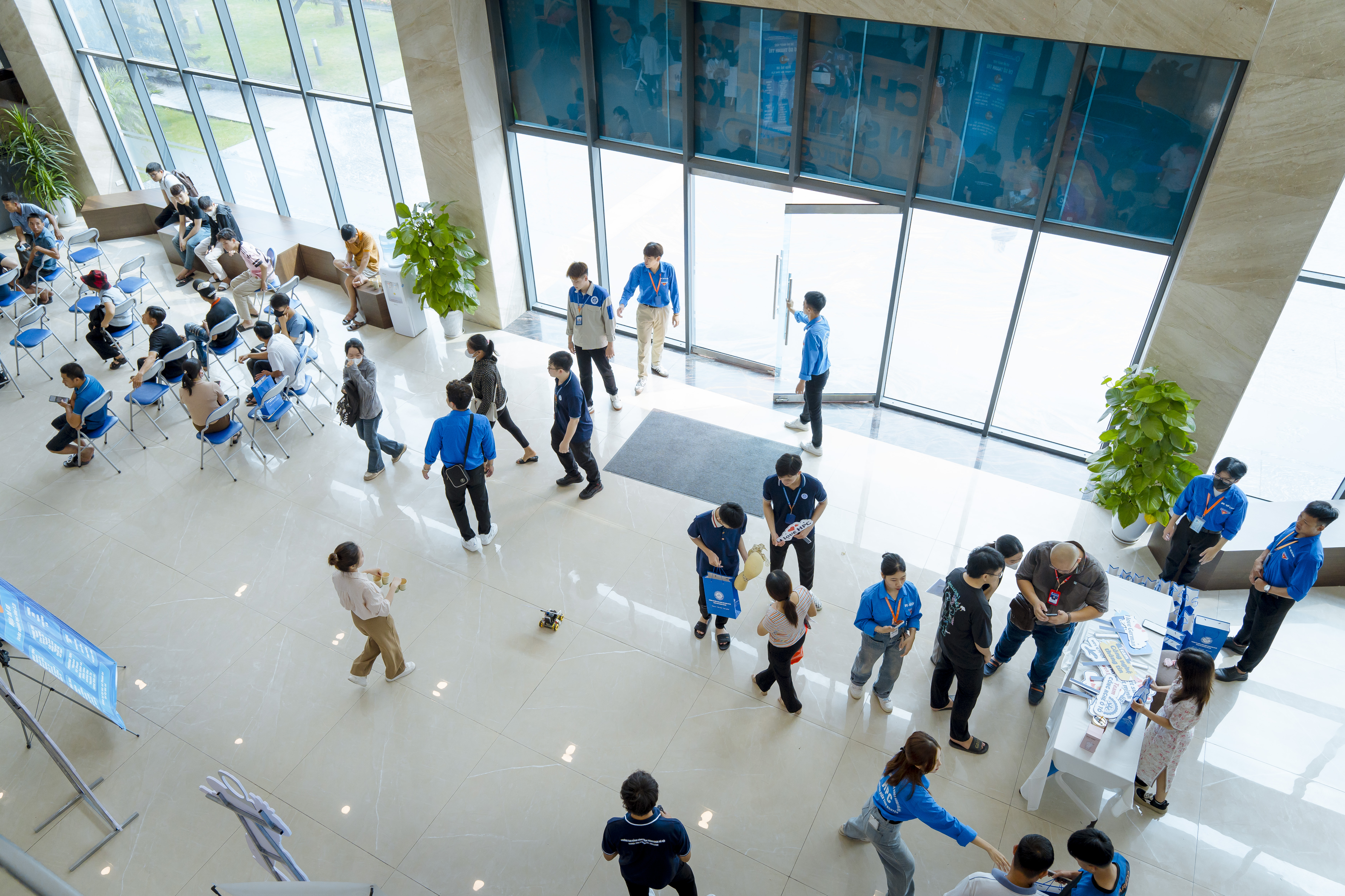 Tuấn mê robot đến mức đứng chôn chân ở sảnh xem biểu diễn một hồi lâu. Ánh mắt cậu “chằm chằm” vào mấy chú robot cầm biển chạy đi chào những người bước vào sảnh. Tuấn tiết lộ từng theo dõi cuộc thi HPC Robot Futsal 2024 trên fanpage của Trường. Cậu thích thú với các trận đấu robot đó và mong có một ngày “chế tạo được robot thông minh hơn” để đi thi đấu.