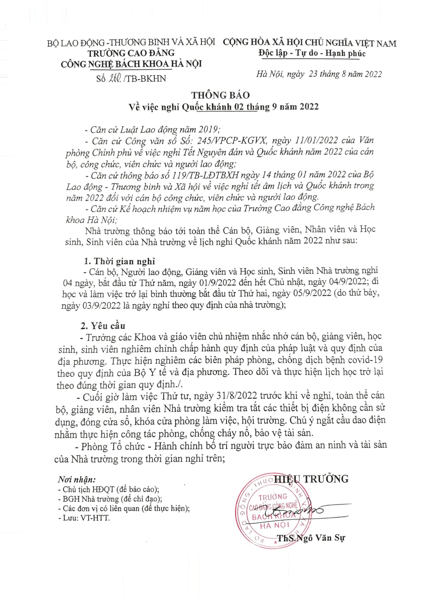 HPC - Hiệu trưởng Trường Cao đẳng Công nghệ Bách khoa Hà Nội thông báo tới toàn thể Giảng viên, sinh viên, học sinh kế hoạch nghỉ lễ Quốc khánh...